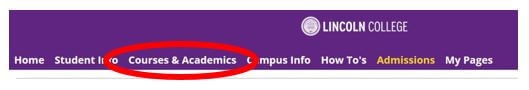 To access the “Add/Drop” area, select the “Courses and Academics” tab from the MyLynx header as shown below.