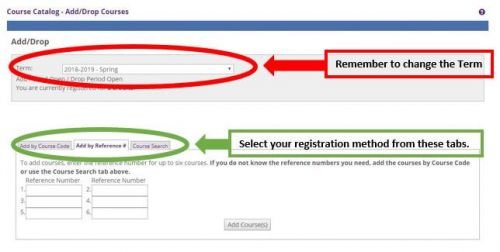 This will open the view just to the left. Before choosing a method of registration, remember to change the Current Term pull-down so that it equals the Term for which you want to add courses. Most students will want to select the full “Year – Term” such as those listed below: