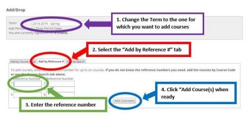 To add a course using the reference number, select the “Add by Reference #” tab of the “Add/Drop” view and enter the reference number into one of the fields shown below.