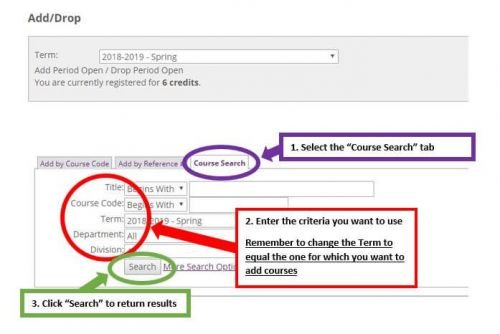 Using “Course Search” you can search through the full schedule for a given term, selecting those you want to add by clicking a check box next to the particular section you wish to add. To start searching for courses, select the “Course Search” tab in the “Add/Drop” view and enter the search criteria you want.