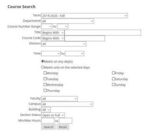 Selecting “More Search Options” expands the search criteria you can use as shown on the next page. Changing only the Term and clicking “Search” will return all of the courses available for that Term, allowing you to page through the schedule with courses listed alphanumerically by catalog number and section.