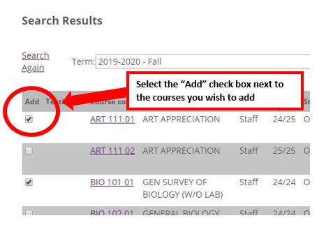 Once you find the desired course in your search results, select it by clicking the “Add” check box in the left-hand column as shown to the right: